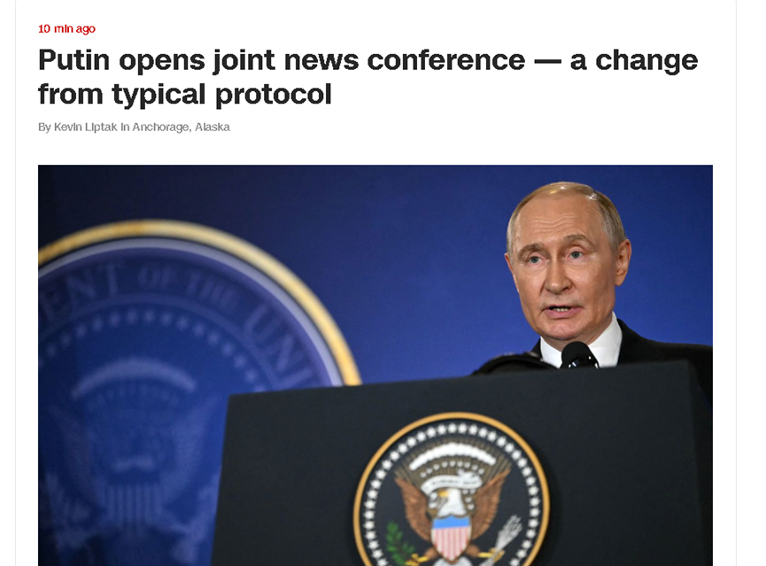 普京在記者會上首先發言。這在美國有線電視新聞網(CNN)看來,是一個打破慣例的情況。因為以往當美國總統會見外國領導人並召開記者會時,先發言的通常會是美國總統。