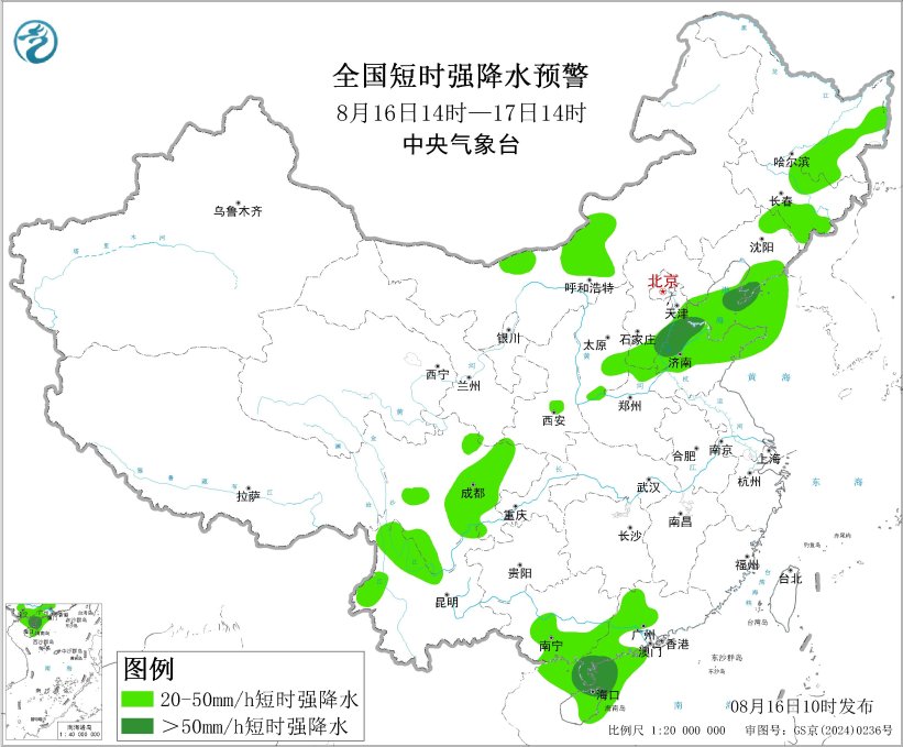 預計8月16日14時至17日14時,內蒙古中西部、東北地區中東部、華北南部、黃淮北部、西南地區東部、華南南部等地的部分地區將有8級以上雷暴大風或冰雹天氣,其中,河北南部、山東北部等地的部分地區將有10級以上雷暴大風;內蒙古中西部、東北地區中東部、華北南部、黃淮北部、西南地區東部和南部、華南中南部等地的部分地區將有小時雨量大於20毫米的短時強降水天氣,其中,遼寧東南部、河北中南部、山東北部、廣東西南部、海南島東北部等地的部分地區小時雨量大於50毫米,最大可達70毫米以上。