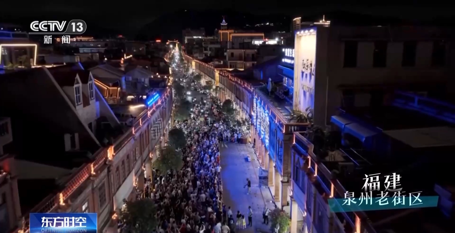 這個夏天,老街區持續迸發消費新活力,世遺之城福建泉州,百年騎樓化作舞台,掌中木偶躍然窗台。燈光投影隨節奏變幻,將每扇窗户化作動態“銀幕”。這場融合傳統技藝與現代聲光電的沉浸式演出,既有非遺的典雅,又有潮流的活力。作為擁有660多幢傳統歷史建築的古城,7月份以來,泉州還推出非遺快閃等多項夜間活動,接待遊客超過141萬人次,同比增長14.8%。