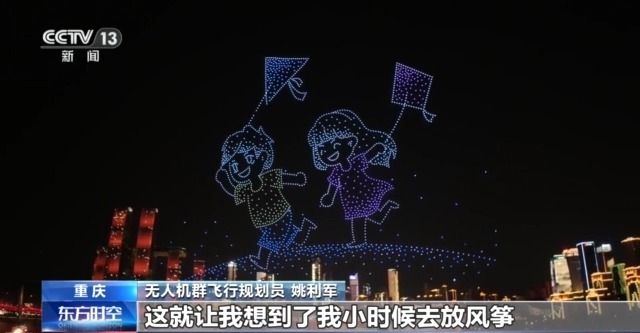 *無人機羣飛行規劃員 姚利軍:*今天晚上有兩個小孩在放風箏的圖案,這就讓我想到了我小時候去放風箏,童年的這種樂趣在成年的時候以科技的形式展現了出來,這種感覺很奇妙,也希望傳達給更多的人,大家在看無人機表演之後能夠感覺更開心、更快樂。