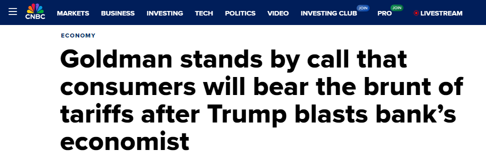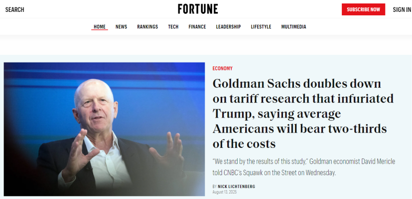另據美國《財富》雜誌(Fortune)網站報道,高盛上週日發佈的一份報告稱,雖然到目前為止美國企業承擔了特朗普政府關税政策帶來的大部分財務壓力,但普通美國人承擔的成本份額將急劇增加,這一負擔在未來幾個月將轉移到美國消費者身上。