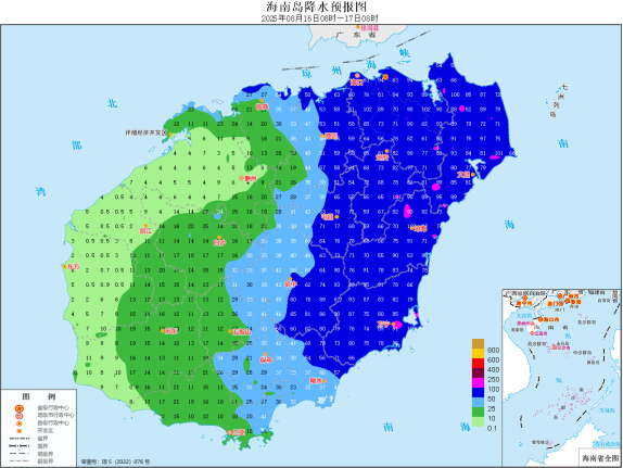 8月16日~18日海南省有較強風雨天氣,大部分海域風力較大。 陸地方面:8月16日~18日,海南島東北半部地區有暴雨到大暴雨;西南半部地區有中到大雨、局地暴雨。另外,海南島東部、西部和南部沿海陸地伴有7~9級陣風,北部沿海陸地陣風6~8級。