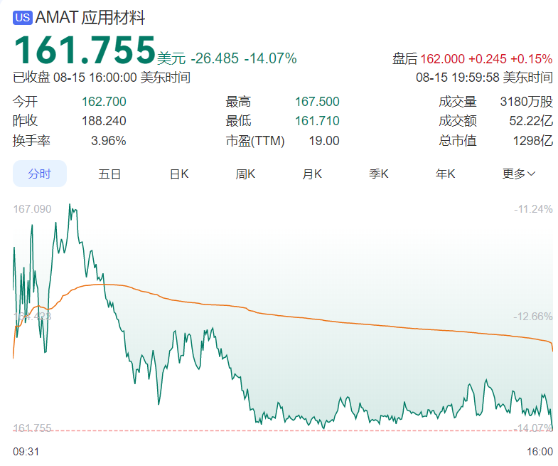 【環球網財經綜合報道】美東時間8月15日,美國半導體設備製造巨頭應用材料在隔夜美股市場遭遇重挫,股價暴跌超14%,單日市值蒸發超212億美元(約合人民幣1523億元),創下自2020年3月以來最大跌幅,總市值縮水至1259.42億美元(約合人民幣9045億元)。受此影響,美國芯片設備製造商KLA Corp、Lam Research股價分別大跌8.4%、7.3%。