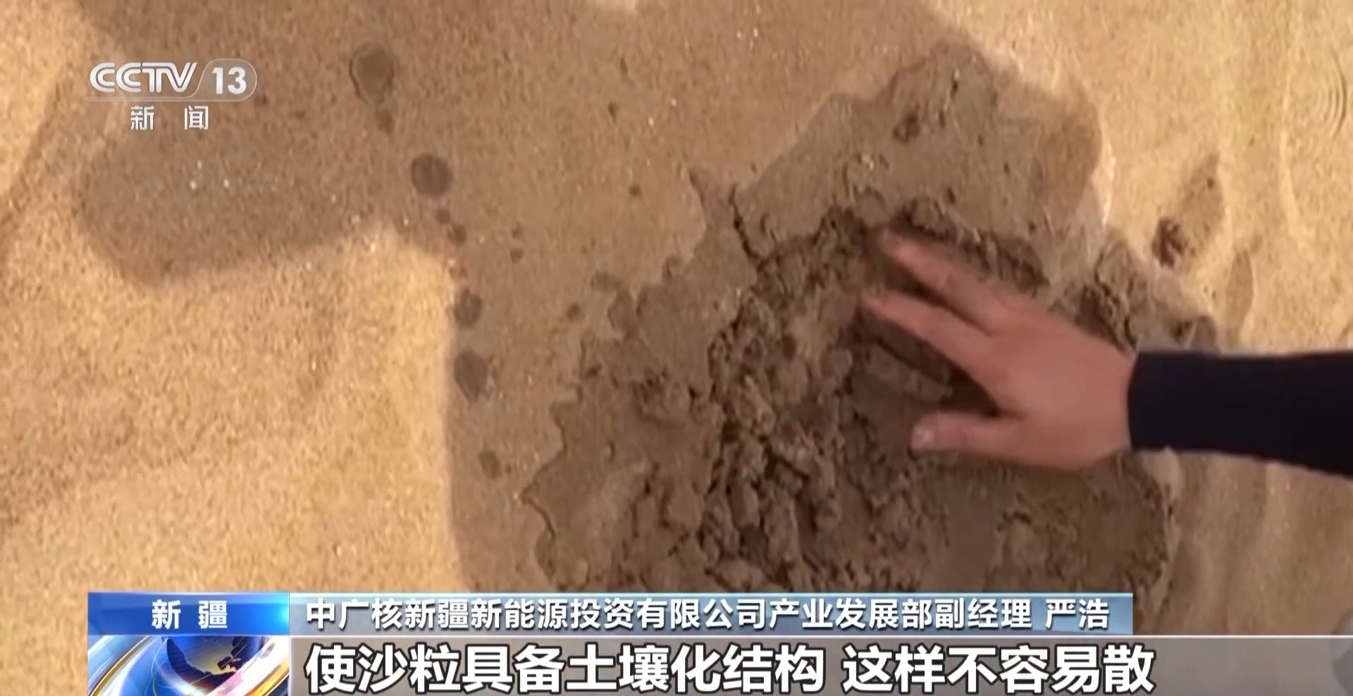 *中廣核新疆新能源投資有限公司產業發展部副經理 嚴浩:*我們的苜蓿地採用“沙膜”技術,使沙粒具備土壤化結構,這樣不容易散,是一塊一塊的,同時也具有保水效果。
