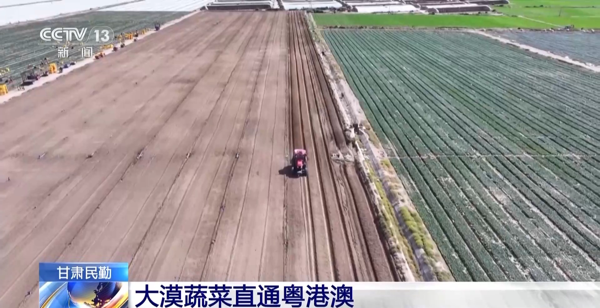 在甘肅民勤蘇武現代農業產業園裏,萬畝菜畦青翠綿延,400多名工人正在採收蔬菜。一輛輛滿載着新鮮蔬菜的冷鏈運輸車整裝待發,38個小時後,60噸新鮮蔬菜就將從大漠抵達粵港澳大灣區的市場。