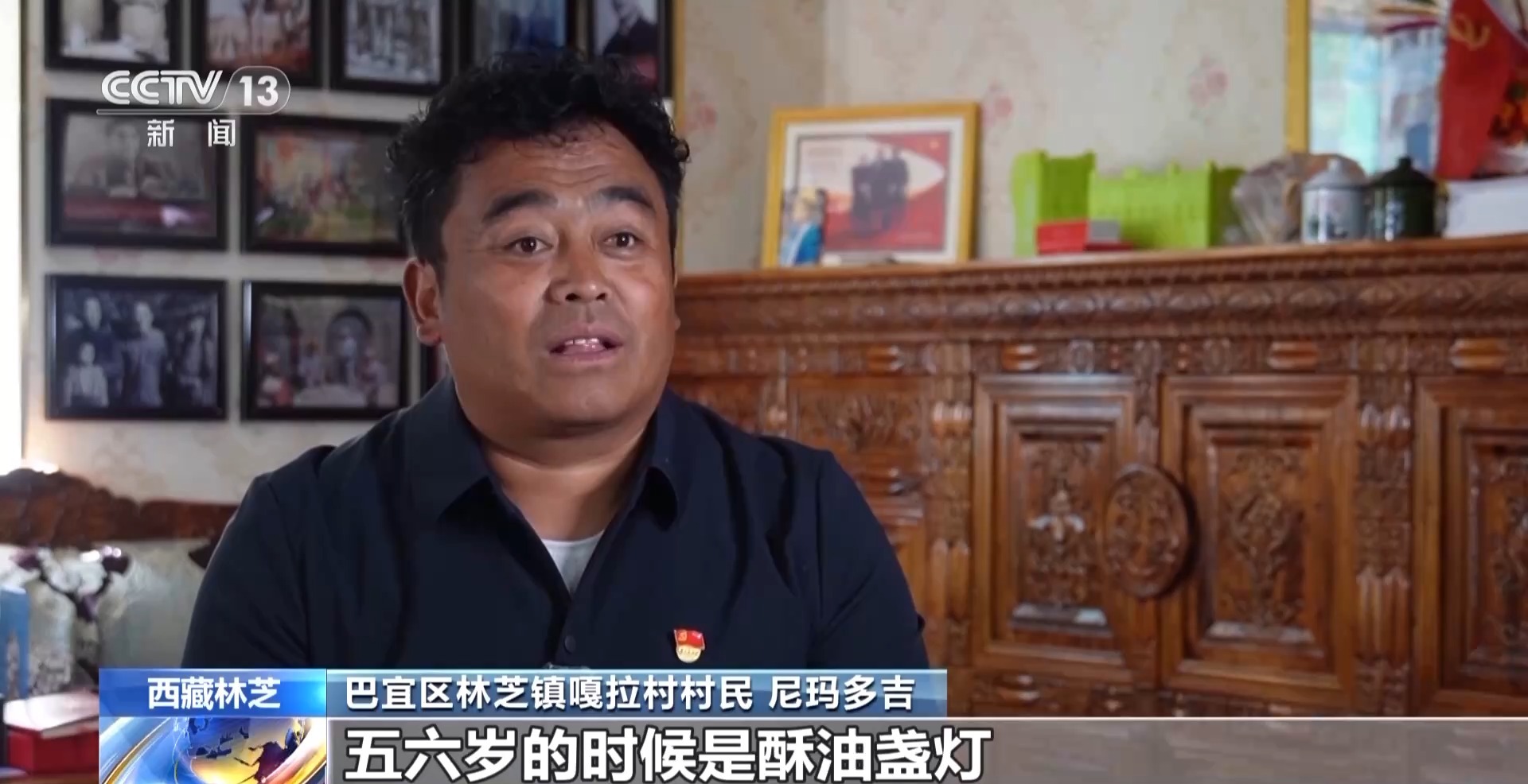 西藏林芝市巴宜區林芝鎮嘎拉村村民 尼瑪多吉*:*過去沒有什麼旅遊收入,步道都是泥巴路,五六歲的時候用的是酥油盞燈。現在不分白天和晚上,跟白天一樣都有光,嘎拉村的步道乾淨整潔。要説這些變化,一天一夜也説不完。