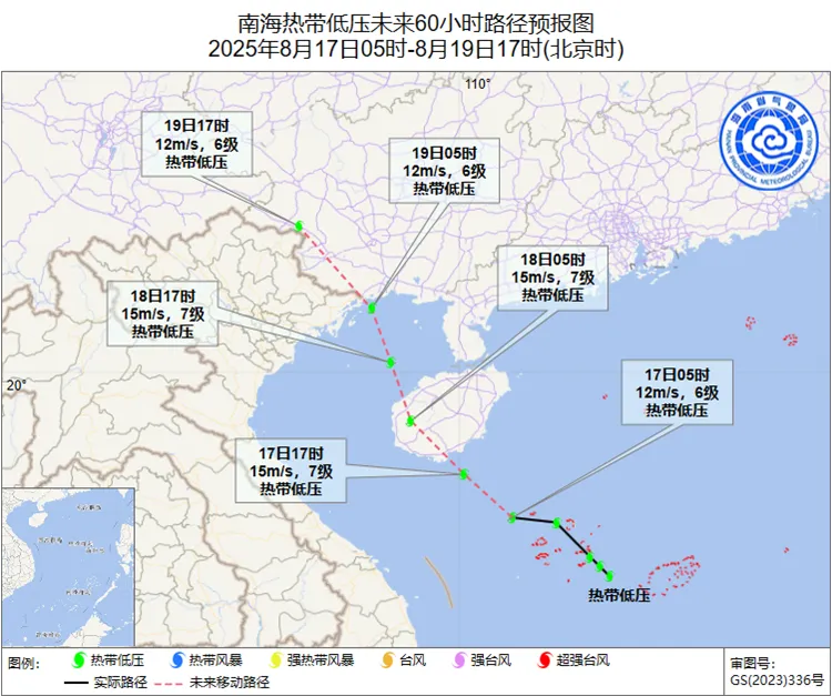 南海中部的熱帶擾動於16日下午加強為熱帶低壓,17日05時其中心位於北緯17.0度、東經111.1度,也就是在三沙市永興島偏西方約135公里的南海中西部海面上,中心附近最大風力6級(12米/秒)。