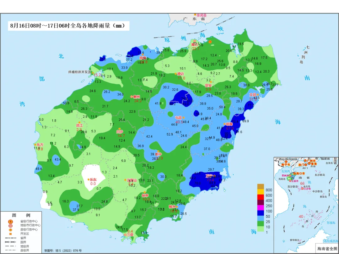 8月17日,海南島北部、東部、中部和南部地區有大到暴雨、局地大暴雨;西部地區有中到大雨、局地暴雨。18日,海南島西部和南部地區有中到大雨、局地暴雨;其餘地區有雷陣雨。另外,海南島四周沿海陸地伴有7~9級陣風。