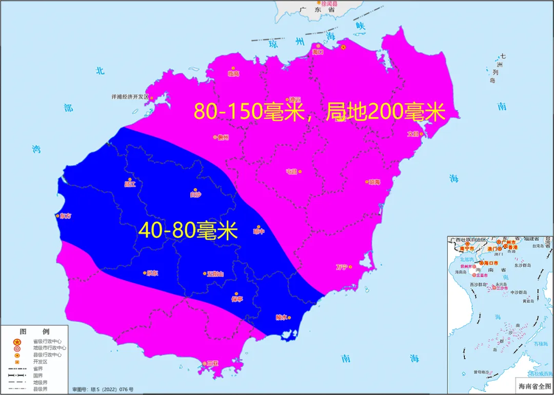 預計,17日08時~19日08時各地累積雨量:海口、臨高、澄邁、定安、文昌、瓊海、萬寧、屯昌、瓊中、儋州、三亞和樂東等市縣80~150毫米、局地200毫米;陵水、保亭、五指山、白沙、昌江和東方等市縣40~80毫米。