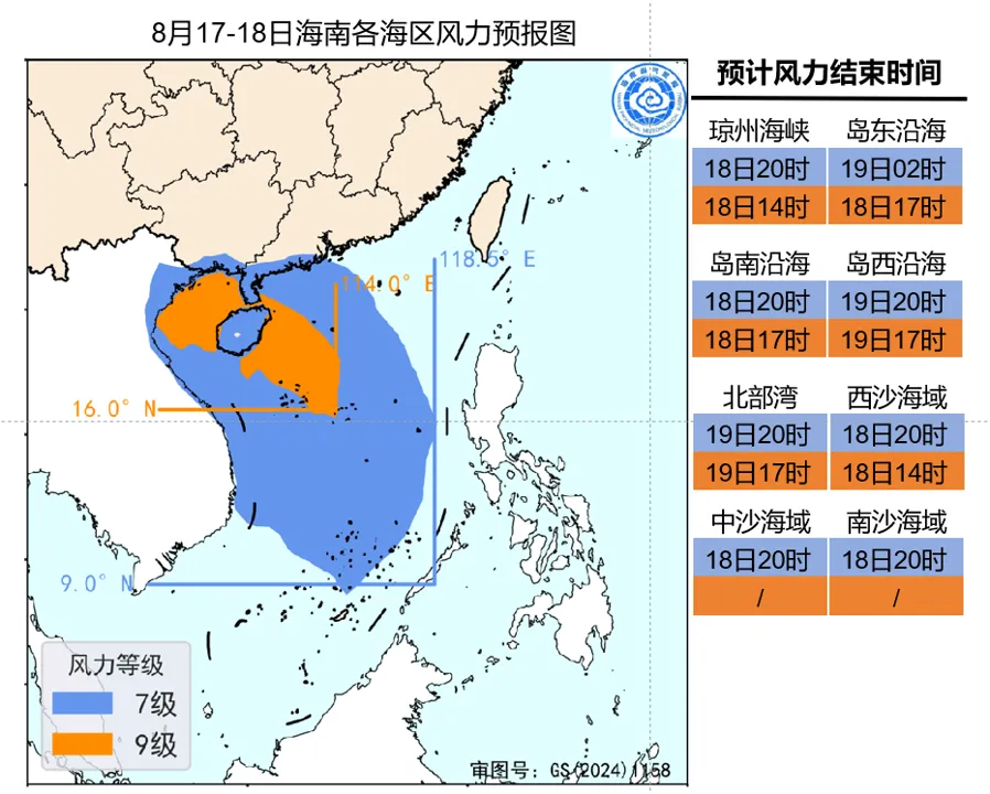 8月17日~18日,西沙羣島附近海面,海南島四周海面,北部灣海面風力6~7級、陣風8~9級;中沙和南沙羣島附近海面風力5~6級、陣風7~8級。