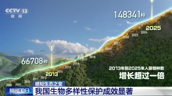 如今,《中國生物物種名錄》上“入冊”的生物種數,從2013年的6.7萬種,增長到2025年的14.8萬種,增長超過1倍。近500種野生動植物的受威脅等級出現下降。