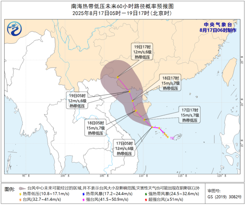 南海中部的熱帶擾動於昨天下午加強為熱帶低壓。預計,該低壓將以每小時10-15公里的速度向西北方向移動,逐漸向海南島南部沿海靠近,強度變化不大,可能於17日夜間至18日凌晨登陸或擦過上述沿海(6-7級,12-15米/秒,熱帶低壓),爾後向北偏西方向移動,移入北部灣,強度逐漸減弱。
