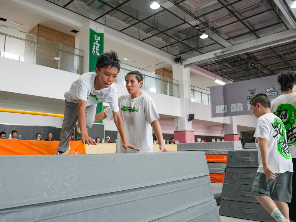 8月5日,在成都一家跑酷訓練基地,小朋友在練習跑酷。新華社記者 王曦 攝