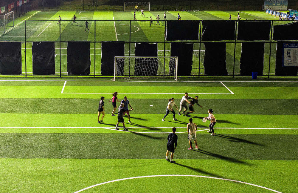 市民在成都市錦江體育公園足球場裏玩飛盤。