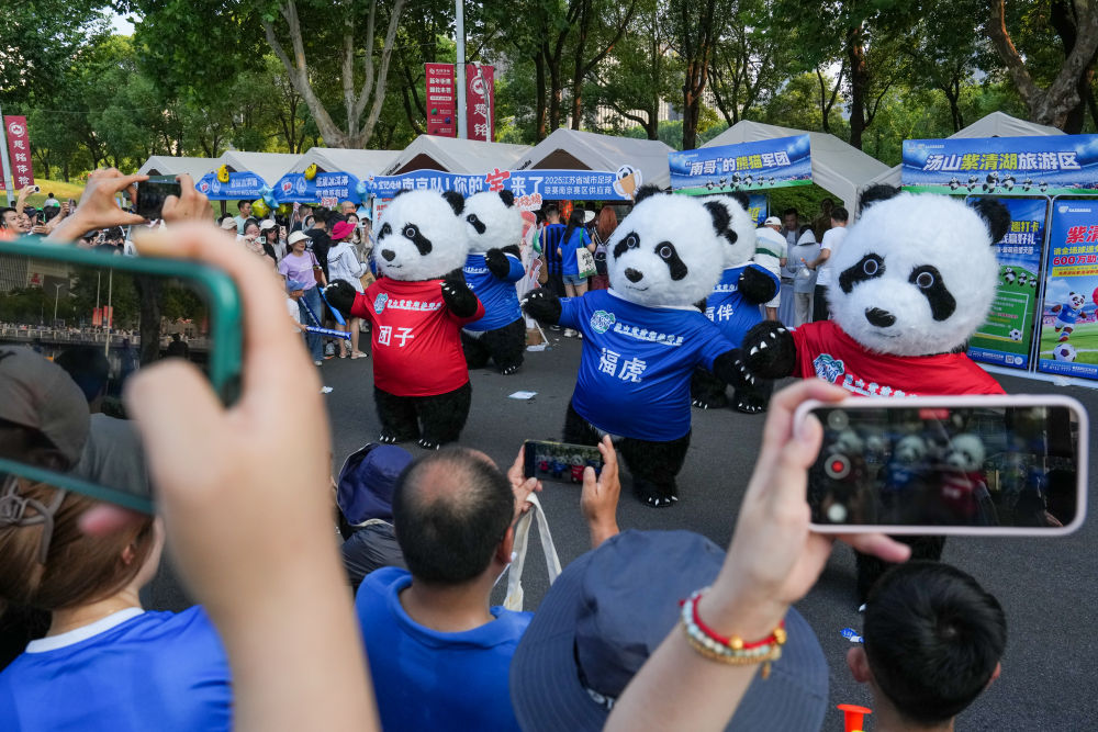 7月5日,在江蘇南京舉行的2025江蘇省城市足球聯賽第六輪比賽前,球迷在場外的文化市集觀看錶演。新華社記者 李博 攝