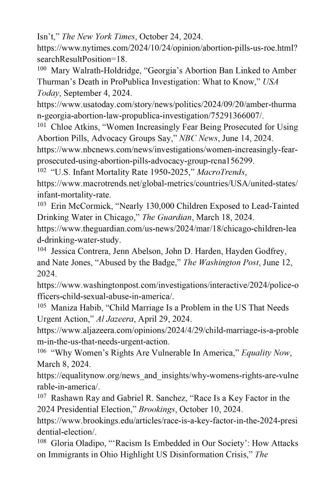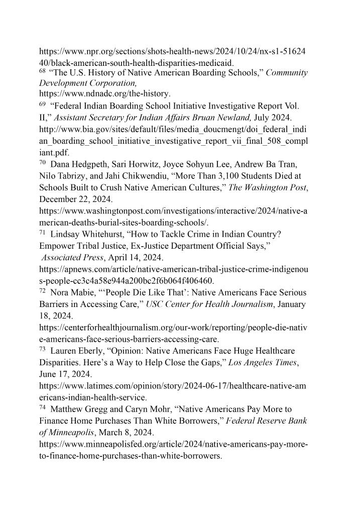 印第安原住民權利慘遭踐踏。美聯社(Associated Press)網站2024年4月14日報道,印第安原住民遭受暴力犯罪、婦女被強姦或被性侵犯的可能性是其他族羣的2倍。(注71)南加州大學健康新聞中心(USC Center for Health Journalism)2024年1月18日指出,原住民在獲得醫療服務上面臨嚴重障礙。蒙大拿州印第安原住民的平均壽命比該州的白人短17年。(注72)《洛杉磯時報》網站2024年6月17日報道,印第安原住民是美國所有種族中死亡率最高、預期壽命最低的族羣,而這些差異並非來自遺傳。(注73)明尼阿波利斯聯邦儲備銀行官網2024年3月8日發文稱,印第安原住民在貸款購房時支付的利率高於白人借款人。保留地內印第安人的貸款利率平均比白人借款人高1.43個百分點。(注74)印第安人權利基金會(Native American Rights Fund)網站2024年8月13日發文指出,印第安原住民在選舉中參與率低。大約四分之一符合資格的印第安原住民未登記投票,比白人選民投票率低約16個百分點,這源於印第安原住民長期遭受排斥的歷史。(注75)