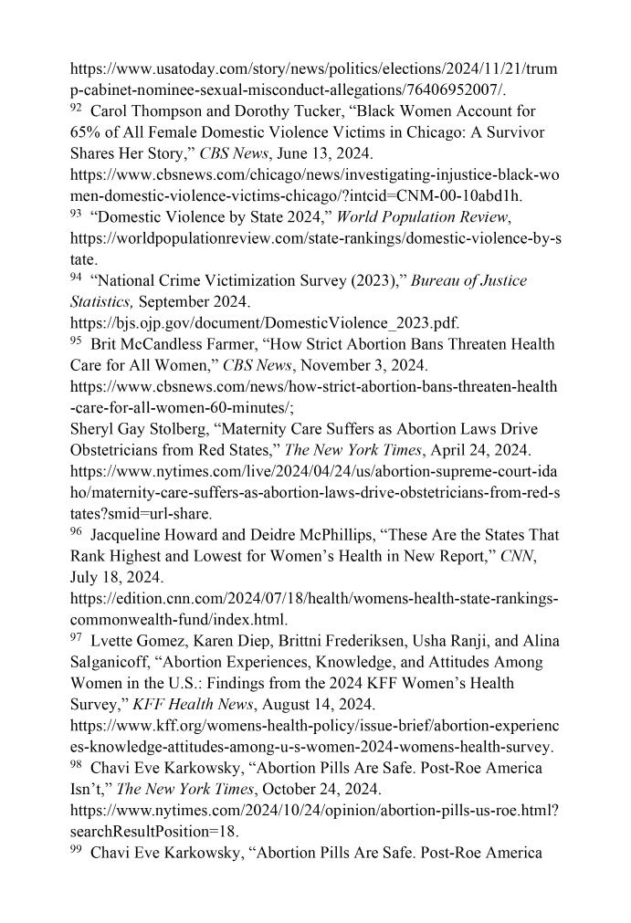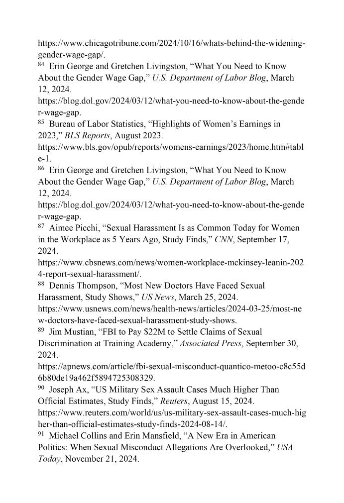 多領域性侵害頑疾難除。性騷擾在美國企業司空見慣。約40%的職業女性在職業生涯中遭遇過性騷擾,即便舉報也不會得到有效處理。(注87)實習醫生遭遇的性騷擾率高得驚人。研究顯示,美國超過一半的新醫生在工作第一年就受到性騷擾。(注88)美國聯邦調查局為平息一起新入職女性遭遇性騷擾的集體訴訟,同意支付超過2200萬美元的和解費用。而該案並非個例,該案代理律師戴維·謝弗(David J.Shaffer)指出,性騷擾在聯邦調查局內普遍存在。(注89)根據布朗大學沃森國際與公共事務研究所戰爭成本項目2024年8月發佈的研究報告,2023年在美國軍隊中發生的性侵案件為73695起,是官方披露數據的2倍多;在阿富汗戰爭的20年中,平均每年有近四分之一的現役女性遭受過性侵。(注90)多位揹負性行為不端指控的人被提名進入美國政府。性別研究專家指出,此舉讓大多數面臨性騷擾或性侵犯的婦女不再相信司法系統會懲罰性侵者。(注91)