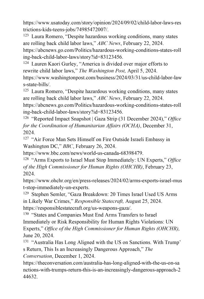 非法僱傭移民童工數量暴增。美國參議院2024年11月9日發佈的報告稱,移民兒童中非法童工數量以令人震驚的速度增加,達到20世紀初以來的最高水平。(注119)根據美國勞工部的數據,2015年至2023年,美國有記錄的違法使用童工行為(不包括未報告行為)涉及的兒童數量激增了472%。(注120)其中相當一部分是移民兒童。僅根據美國勞工部披露的數據,2024財年各行業就有4030名兒童被違法僱傭。在該部門提起的736起訴訟中,近一半涉及違反危險職業法僱傭兒童。美國廣播公司網站2024年12月7日報道,移民兒童在美國不僅從事農業和食品供應工作,還從事建築和修理屋頂等危險工作。(注121)面對童工激增的局面,當局的應對措施卻是修改童工立法,放寬限制使非法行為“合法化”,為剝削兒童大開方便之門。(注122)根據經濟政策研究所(Economic Policy Institute)的數據,自2021年以來,至少有30個州提出或通過了削弱童工保護的法案,其中9個州通過了擴大兒童在危險職業或工作場所就業的法案。僅2024年,就有11個州提出或採取了新的法案取消童工保護。(注123)《華盛頓郵報》網站報道,印第安納州的新法律延長了14歲和15歲兒童的合法工作時長,廢除了對16歲及17歲兒童的所有工作時間限制。佛羅里達州的法律允許16歲和17歲的兒童連續工作超過7天,取消對所有就讀於在線或家庭學校的兒童的工作時長限制,允許他們通宵工作。艾奧瓦州的立法則允許該州的兒童從事一些過去被認為過於危險的工作。(注124)這些法律非但沒有為兒童權益提供保護,反而成為“剝削兒童”的工具。對此,紐約大學學者特里·格斯坦(Terri Gerstein)批評稱,“削弱對童工保護的法律是不道德的、徹頭徹尾錯誤的決定。弱化和倒退的童工法導致更多的孩子在工作中肢體傷殘,甚至喪生。”(注125)