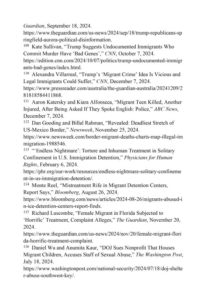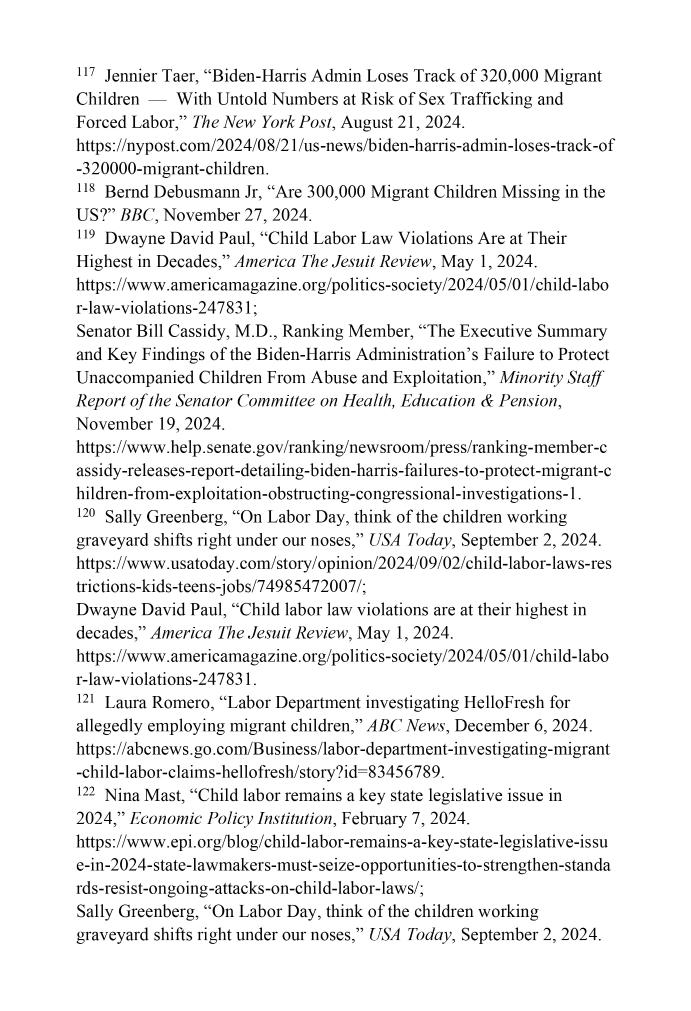 數十萬移民兒童下落不明。移民兒童入境美國後,被迫與家庭分開拘留,在被釋放後失聯,等待他們的是被剝削、虐待、強迫勞動甚至面臨生命危險。英國廣播公司網站2024年11月27日報道,由於政府將入境的無陪伴移民兒童釋放給“未經妥善審查”的美國境內的成年擔保人,2018年至2023年9月,共有超過32萬名無父母陪伴的移民兒童在美國失去行蹤。(注117)其中許多兒童可能被誘騙從事強迫勞動和性交易,處於被虐待、剝削和販運的境地。(注118)
