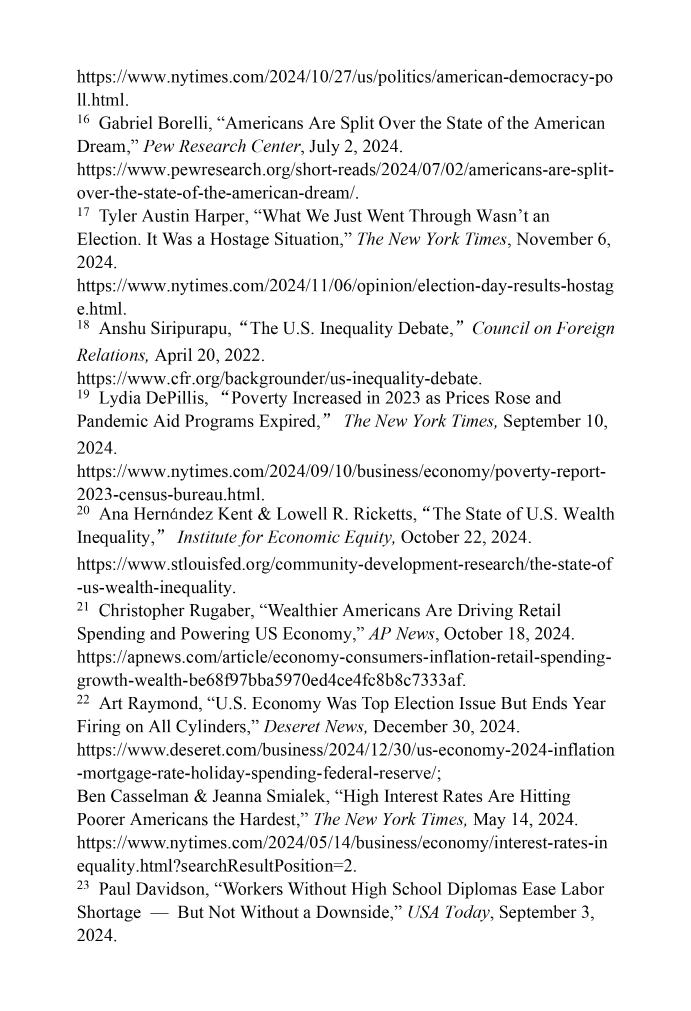 民眾對美式民主失望至極。根據《紐約時報》和錫耶納學院2024年10月28日的調查數據,幾乎一半的選民對美國政治體制的成效表示懷疑,62%的受訪者認為美國政府主要為精英階層而非普通民眾服務。(注15)皮尤研究中心(Pew Research Center)的數據顯示,41%的美國人曾經相信的“美國夢”已經破滅,60%的18至29歲年輕人認為“美國夢”已無法實現甚至從未實現過。(注16)美國貝茨學院學者泰勒·哈勃(Tyler Austin Harper)2024年11月6日發表文章稱,“美國政治體系已經從根本上崩潰了”,兩黨代表着特殊利益集團的利益,“甚至毫不掩飾對選民需求的漠視”。絕大多數選民認為美國正走在錯誤的道路上;近80%的人表示,大選並沒有讓他們為美國感到驕傲。(注17)