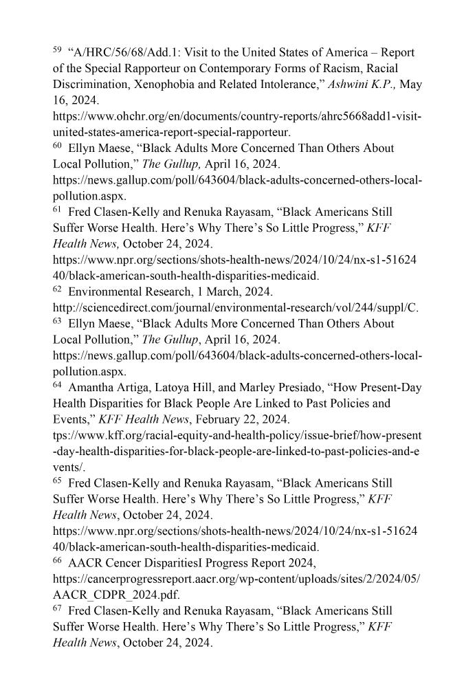 環境種族主義貽害無窮。聯合國人權專家2024年5月16日發佈的報告指出,在美國“那些面臨着系統性不平等和種族主義狀況的羣體承受着氣候和生態危機帶來的不成比例的惡劣影響”。(注59)美國疾病控制與預防中心(Centers for Disease Control and Prevention)和美國肺臟協會等組織認為,不同種族生活環境的污染及其危害程度存在顯著差異,這是導致眾多健康狀況差異的根本原因。由於種族隔離和“紅線政策”等歷史原因,非洲裔更有可能暴露在有害或污染的環境中。(注60)凱澤家庭基金會(Kaiser Family Foundation, KFF)2024年10月24日報道,美國近80%的城市固體廢物焚燒爐建造在非洲裔、拉美裔和低收入社區,這可能導致癌症等一系列惡性疾病高發。(注61)《環境研究》(Environmental Research)2024年3月刊登的美國杜蘭大學、孟菲斯大學、路易斯安那州立大學3位學者聯合署名的一項研究結果指出,路易斯安那州“癌症帶”(Cancer Alley)區域化學工廠密集,那裏的人口以非洲裔為主,當地居民因工業空氣污染罹患癌症的風險高居美國之首,是全國平均值的7倍多,空氣污染對當地孕產婦和新生兒健康的損害高達全國平均值的3倍。(注62)蓋洛普公司(The Gullup)的調查結果顯示,環境污染正在使大量美國非洲裔流離失所。僅在2023年5月至2024年4月的12個月內,大約400萬非洲裔因污染不得不暫時搬遷,另有200萬人不得不永久搬遷。(注63)