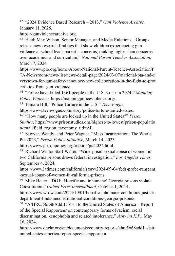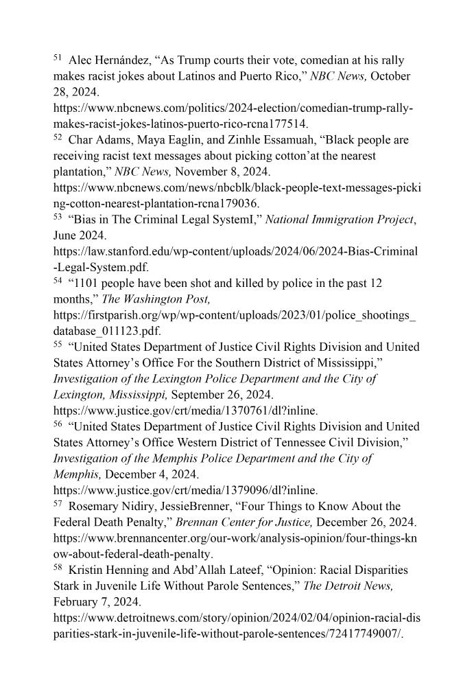 系統性種族歧視籠罩執法司法體系。美國律師協會和斯坦福大學2024年6月發佈的報告《刑事法律系統中的偏見》指出,美國的種族偏見存在於逮捕、保釋、指控、判刑等刑事程序的各個階段。與違法情節相似的白人相比,非洲裔和拉美裔更容易被警察逮捕,受到更多的審前拘留和更嚴厲的刑罰。在涉及輕微的交通、毒品和財產犯罪時,種族差別對待尤為明顯。(注53)種族歧視更突出體現在警察暴力執法中。在有記錄的美國警察暴力致死事件中,非洲裔的遇害率是白人的3倍,印第安原住民的遇害率是白人的2.2倍,拉美裔的遇害率是白人的1.3倍。(注54)美國司法部調查報告指出,密西西比州列剋星敦警察局“建立了一個可以讓警察肆意違法的體系”,這個約76%居民是非洲裔的鄉村小鎮,存在着令人震驚的種族歧視性執法和騷擾現象。(注55)美國司法部的調查報告發現,田納西州孟菲斯市警察局過度使用武力,歧視性對待非洲裔美國人,特別體現在兒童身上。2018年1月至2023年8月,該地因違反宵禁或遊蕩規定而被捕的非洲裔兒童有180名,而白人兒童只有4名;因擾亂治安而被捕的非洲裔兒童有120名,而白人兒童只有1名。(注56)布倫南司法中心網站2024年12月10日報道,美國聯邦司法機構針對某些聯邦罪行所作的判決,在死刑的適用上存在種族差異。在得克薩斯州,聯邦審判中非洲裔被判處死刑的可能性是其他族裔的16倍。(注57)《底特律新聞》(Detroit News)網站2024年2月4日報道,非洲裔約佔美國總人口的13%,但在所有被判處終身不得假釋的兒童中,61%是非洲裔。(注58)