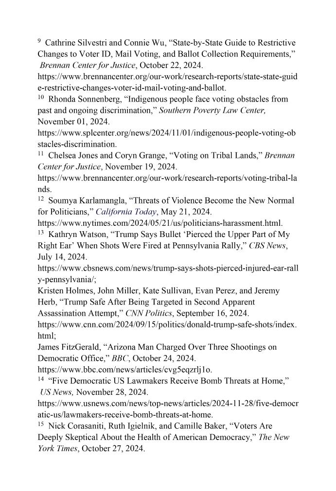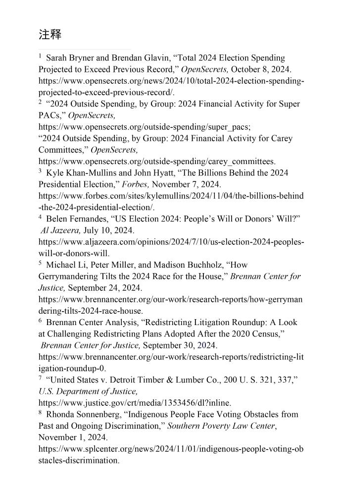 選舉規則壓制選民投票權利。南部貧困法律中心(Southern Poverty Law Center)網站2024年12月1日報道,2020年以來,已有24個州通過了壓制選民的限制性法案,17個州通過了新的或更嚴格的選民身份證法。(注8)這些法律在選民身份證明、郵寄投票等方面規定了過於繁瑣的限制性要求,對老年人、少數族裔、殘疾人、低收入選民和學生的影響尤為嚴重。(注9)根據投票騎士組織(Vote Riders)的研究,美國有色人種公民缺乏投票所需身份證件的可能性接近白人的4倍。許多符合資格的選民無論政治派別如何,都會因為不瞭解他們居住地的選民身份證法而無法行使選舉權。(注10)布倫南司法中心(Brennan Center for Justice)2024年11月19日發佈的一項研究報告顯示,印第安原住民的投票率歷來是所有羣體中最低的,但美國政府始終未採取行動改善他們的投票條件,導致其行使選舉權的機會被普遍剝奪。(注11)