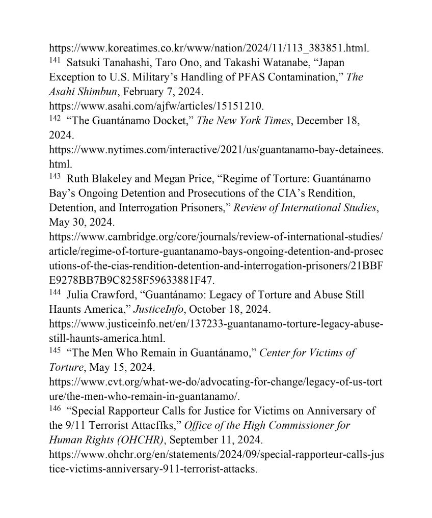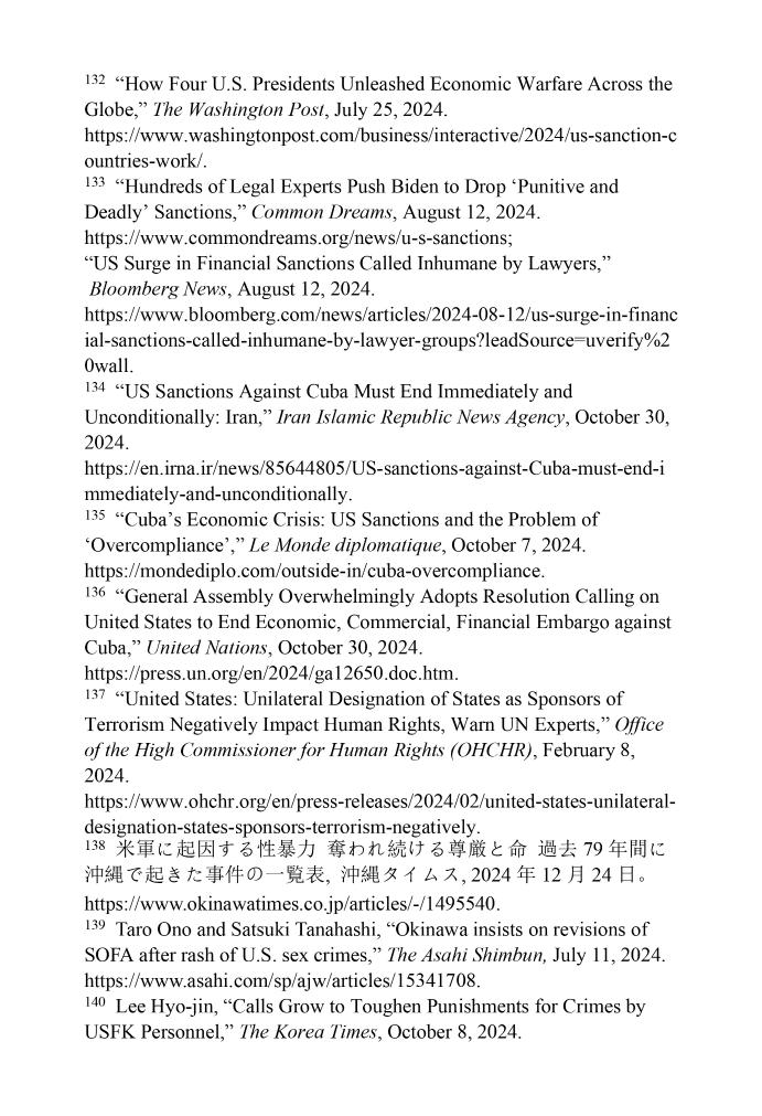 海外駐軍禍害當地人民。《沖繩時報》網站2024年12月24日發佈的報告顯示,自1945年美軍登陸沖繩羣島以來,該地區記錄在案的由美軍人員引發的性暴力事件累計高達371起,這些事件對當地民眾的尊嚴與生命造成了持續性侵害與剝奪。(注138)《朝日新聞》網站2024年7月11日報道,針對駐紮美軍實施的一系列性犯罪案件,沖繩縣議會要求駐日美軍採取措施防止類似事件再次發生,並對賦予駐日美軍法律特權的《日美地位協定》作出修改。(注139)《韓國時報》網站2024年10月8日報道,在過去五年中,駐韓美軍的性暴力行為和其他罪行接連不斷,引發公眾強烈抗議。(注140)《朝日新聞》網站2024年2月7日報道,針對軍事基地附近檢測到的致癌性有機氟化合物,沖繩縣政府多次要求美國各軍事基地調查水質污染原因,而美國軍方置若罔聞。(注141)