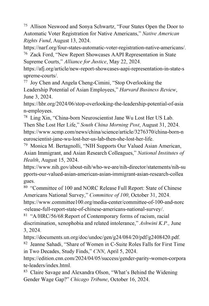 亞裔在多領域面臨歧視。美國正義聯盟(Alliance for Justice)2024年5月22日發佈的報告指出,19世紀和20世紀的大部分時間裏,亞裔在美國社會的許多方面都被排除在外。直到今日,仍有41個州的最高法院從未有過亞裔法官,儘管其中一些州擁有大量亞裔人口。該報告認為,這種明顯的代表性缺失凸顯了系統性歧視,使得亞裔繼續被排除在司法機構的關鍵職位之外,導致種族差異和不平等的歷史不斷固化。(注76)《哈佛商業評論》(Harvard Business Review)網站2024年6月2日報道,儘管亞裔在美國勞動力羣體中受教育程度最高,但他們在所有種族羣體中晉升領導職位的可能性卻最低。對財富500強中頂級科技公司的分析顯示,亞裔如今在職業生涯中晉升的可能性比10年前還要小。儘管亞裔約佔美國專業勞動力的13%,但他們在財富500強企業高管中只佔1.5%。此外,超過一半的財富1000強公司董事會沒有亞裔董事。(注77)
