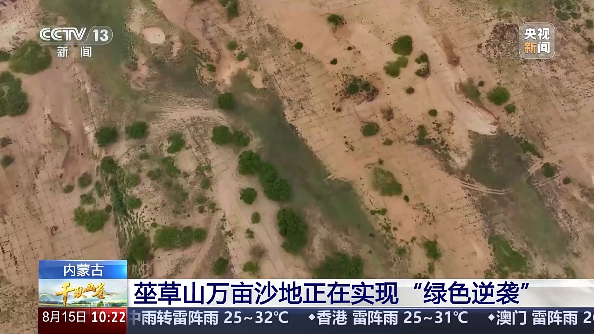跟隨衞星視角,這裏是內蒙古高原東部的渾善達克沙地。莝草山,位於赤峯市克什克騰旗,由於西北風常年吹蝕,這裏遍佈沙丘和風蝕坑。去年5月,當地啓動綜合治理。通過衞星影像,我們能清晰地看到密密麻麻的草方格,如同編織的棋盤,縱橫交錯、緊密相連,其中很多已經萌發出綠意,牢牢鎖住流沙奔襲的腳步。