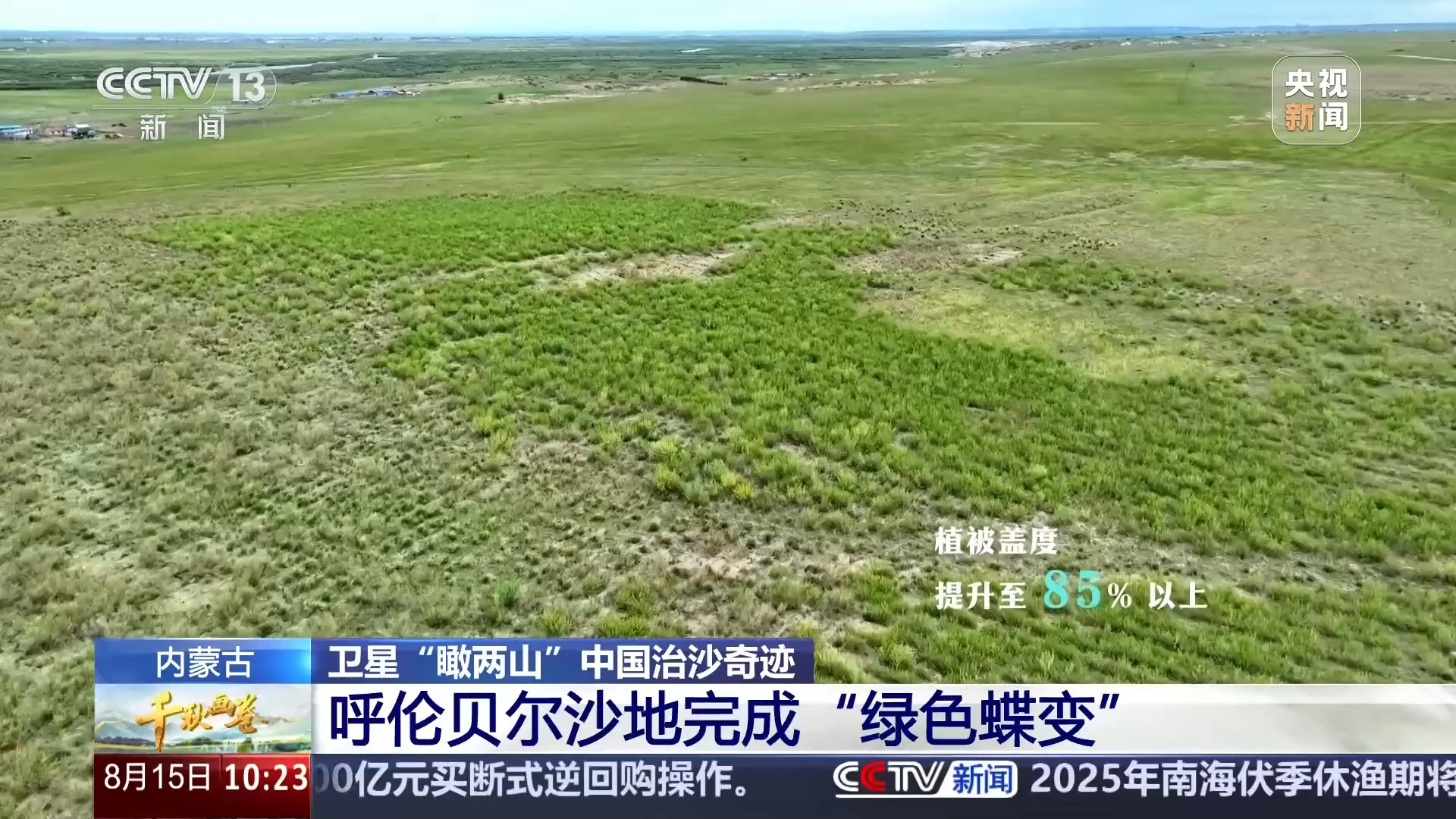 這裏是內蒙古陳巴爾虎旗,位於四大沙地中最北部的呼倫貝爾沙地。時間退回到2019年,這裏卻是土地沙化的“生態重災區”,流動沙丘與風蝕坑遍佈。2020年,當地啓動退化草原生態修復,現在修復區內95%以上的流沙面積得到有效控制,植被覆蓋度提升至85%以上,實現了綠色蝶變。