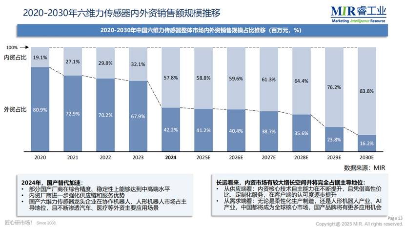 另據MIR睿工業日前發佈的《2025年中國人形機器人六維力傳感器市場調研報告》更揭示了該領域的爆發態勢,2024年中國人形機器人領域六維力傳感器出貨量同比大增1100%,國產化率從四年前的19%躍升至57.8%,標誌着國產傳感器企業全面進入技術兑現期。