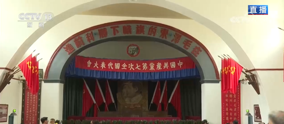 這座禮堂是一座中西合璧的建築,外部是吸納了西式的建築風格,而內部是採用了窯洞的拱形結構。大家現在看到的,禮堂內部的陳列是根據當時七大召開時的原貌復原的。