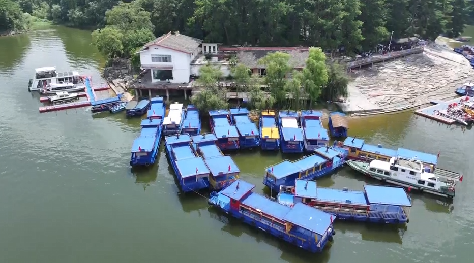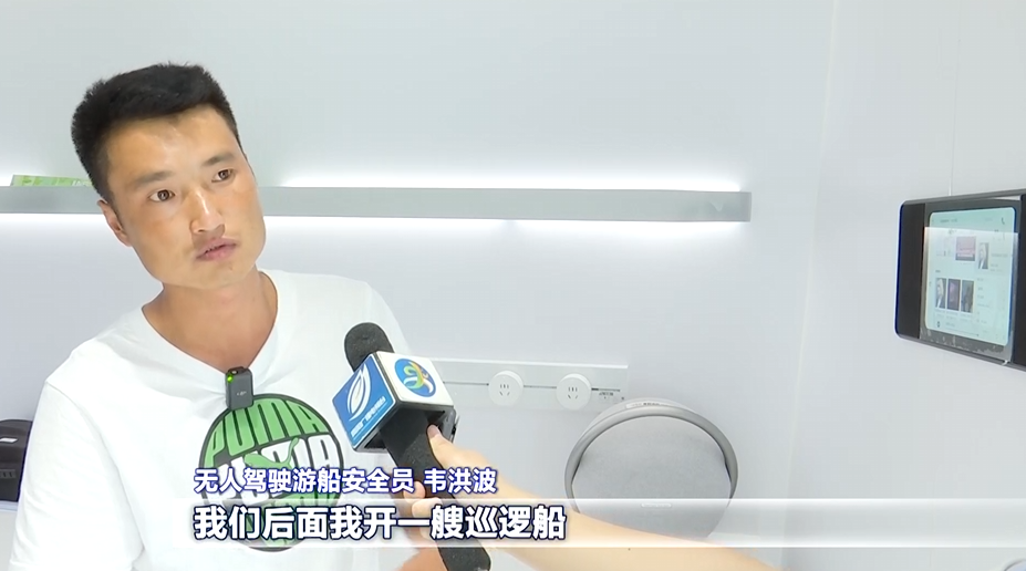 無人駕駛遊船安全員 韋洪波*:*這個人工智能遊船它是智能無人駕駛的,客人買了票上來給他把線路定好,定了之後客人出來,我們後面我開一艘巡邏船,負責水上的安全。