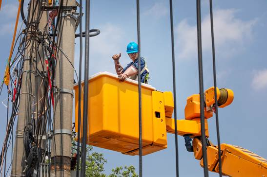 When the work team arrived at Hushan Road, heat waves were already rising from the ground. The local team, which had made advance plans, had opened a temporary passage before the morning rush hour and arranged special personnel to guide electric vehicle traffic. Live-line operation workers quickly got to work—setting up the outriggers of the insulated aerial work platform, carefully laying out safety tools, and checking insulation performance… They prepared methodically in accordance with standardized procedures. During the pre-work meeting, the work supervisor detailed the precautions. Afterwards, the fully-equipped workers boarded the aerial platform, which was slowly lifted to a height of 12 meters, level with the top of the utility pole.