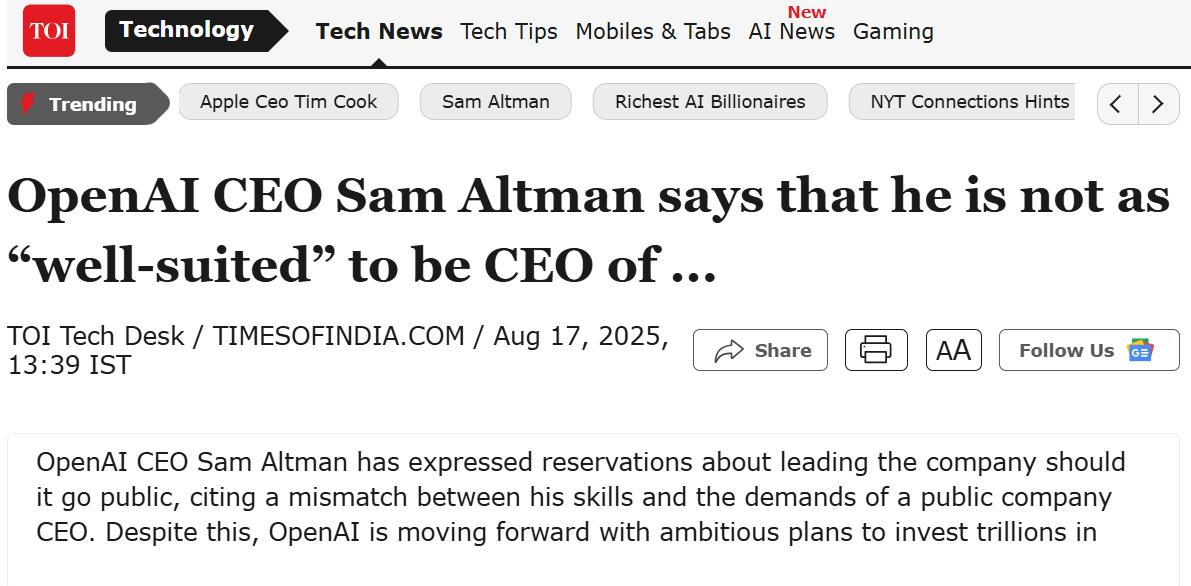 Altman 表示,儘管他負責管理 OpenAI 的多項重要項目,但他認為自己的技能與上市公司 CEO 的要求不匹配。他指出,上市公司的 CEO 需要具備特定的管理能力和市場敏感度,而他可能不是最合適的人選。