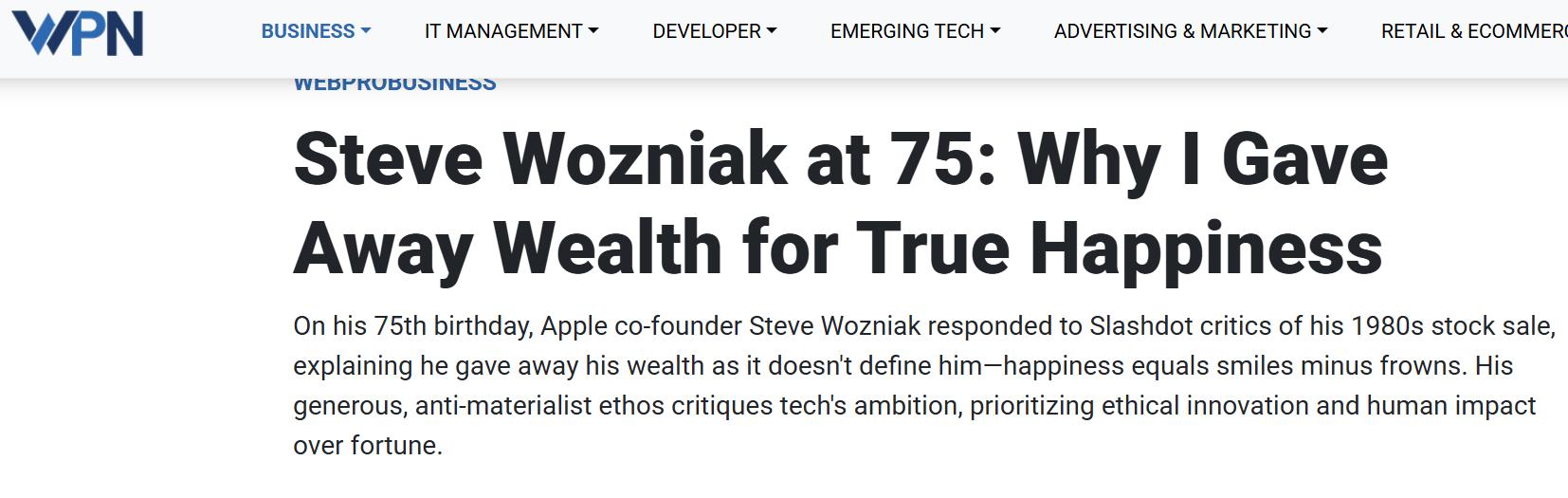 【環球網科技綜合報道】8月18日消息,據外媒webpronews報道,蘋果聯合創始人史蒂夫·沃茲尼亞克(Steve Wozniak)在其 75 歲生日之際,通過 Slashdot 網站回應了對其上世紀 80 年代出售大部分蘋果股票決定的批評。沃茲尼亞克強調,他捐出財富是因為“財富和權力不是我生活的目的”,並提出了他的人生等式——幸福,就是微笑減去皺眉。