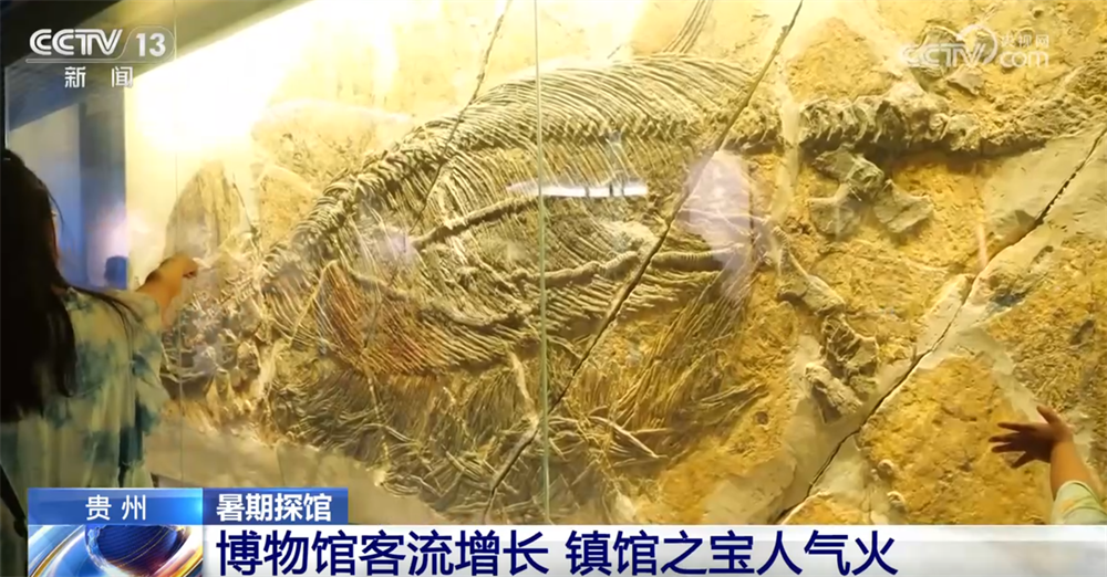 這個暑期,貴州省地質博物館同樣人氣爆棚,遊客接待量突破35萬人次,其中6到12歲的兒童佔比近兩成。館內有3萬多件古生物化石、礦物晶體等展品,這塊長9米多的梁氏關嶺魚龍懷孕標本就是其中一件“鎮館之寶”。
