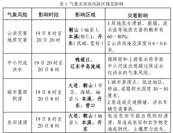 2.中小河流洪水:鴨綠江、遼東半島流域需關注上游客水與本地強降雨疊加效應,出現中小河流洪水的氣象風險較高,需加強河流、水庫、堤防等災害隱患點巡查排險,提前做好汛限水位監管和防汛應對工作。