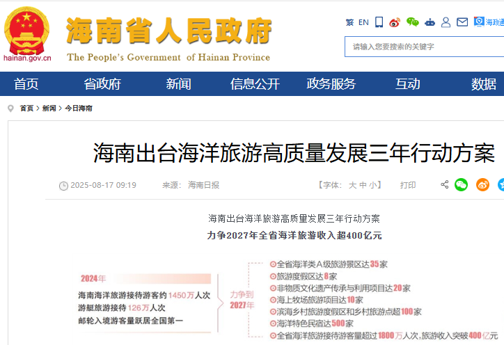 【環球網消費綜合報道】近日,海南省建設國際旅遊消費中心和旅遊市場整治領導小組印發《海南省海洋旅遊高質量發展三年行動方案(2025—2027年)》,錨定“向海圖強、再造一個海上海南”戰略目標,明確未來三年海南海洋旅遊發展路徑,力爭到2027年實現海洋旅遊收入突破400億元。