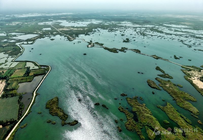 俯瞰塔克拉瑪干沙漠邊緣的拉里昆國家濕地公園(8月6日無人機攝)。天山網-新疆日報記者 鄒懿 攝