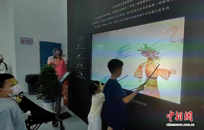 8月15日,2025“新疆是個好地方”非遺援疆主題展示活動在新疆和田約特幹故城開幕。圖為孩子們在現場體驗“龍宮戲影——數字皮影戲觸控互動體驗”裝置。 中新社記者 應妮 攝