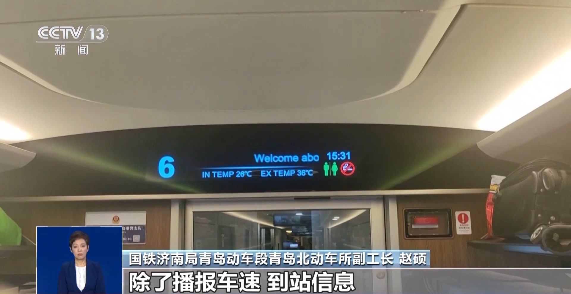 *國鐵濟南局青島動車段青島北動車所副工長 趙碩:*我們這個車窗用的是中空玻璃,中間充滿惰性氬氣的中空層能大幅減少熱傳導,隔熱效果非常明顯,再把遮陽簾一拉就能阻擋陽光直射。車廂裏的顯示屏除了播報車速到站信息,還能即時播報車內外温度。