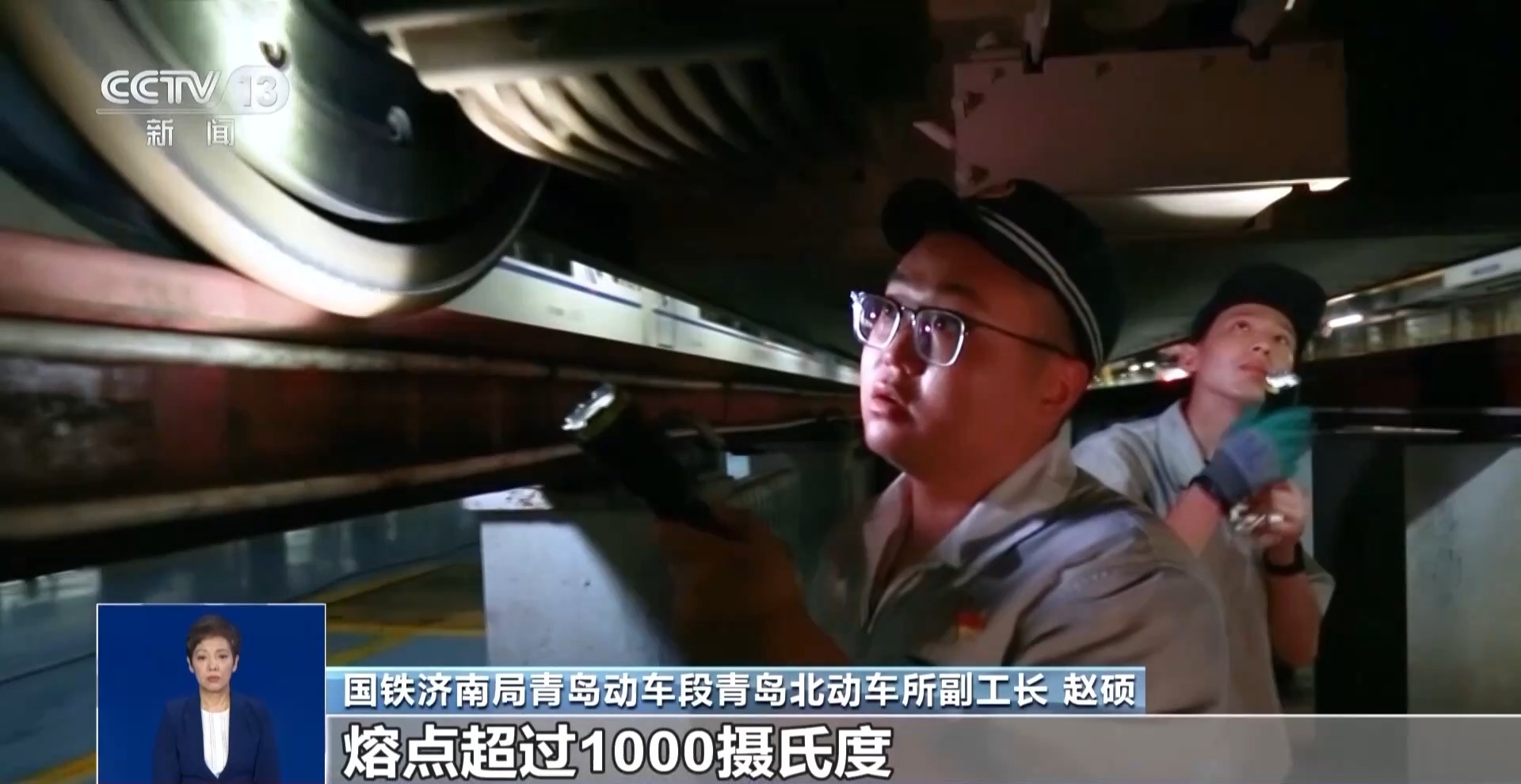 *國鐵濟南局青島動車段青島北動車所副工長 趙碩:*除了地面温度高,高速運轉的車輪和軌道之間摩擦也會產生熱能。車輪採用的是最高強度的特種鋼材,熔點超過1000℃,安全性和可靠性都很強,完全不用擔心“燙腳”。