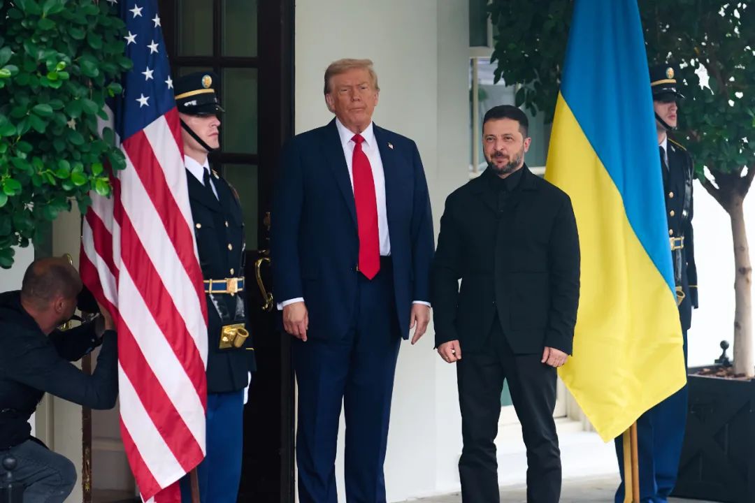 當地時間18日下午1時許,澤連斯基的座車駛入白宮。特朗普在西翼入口迎接,雙方握手寒暄合影。而早前一個小時,北約秘書長呂特、歐盟委員會主席馮德萊恩、英國首相斯塔默、意大利總理梅洛尼、芬蘭總統斯圖布、德國總理默茨、法國總統馬克龍陸續抵達時,在門口迎接的是美國國務院禮賓司司長莫妮卡·克勞利。