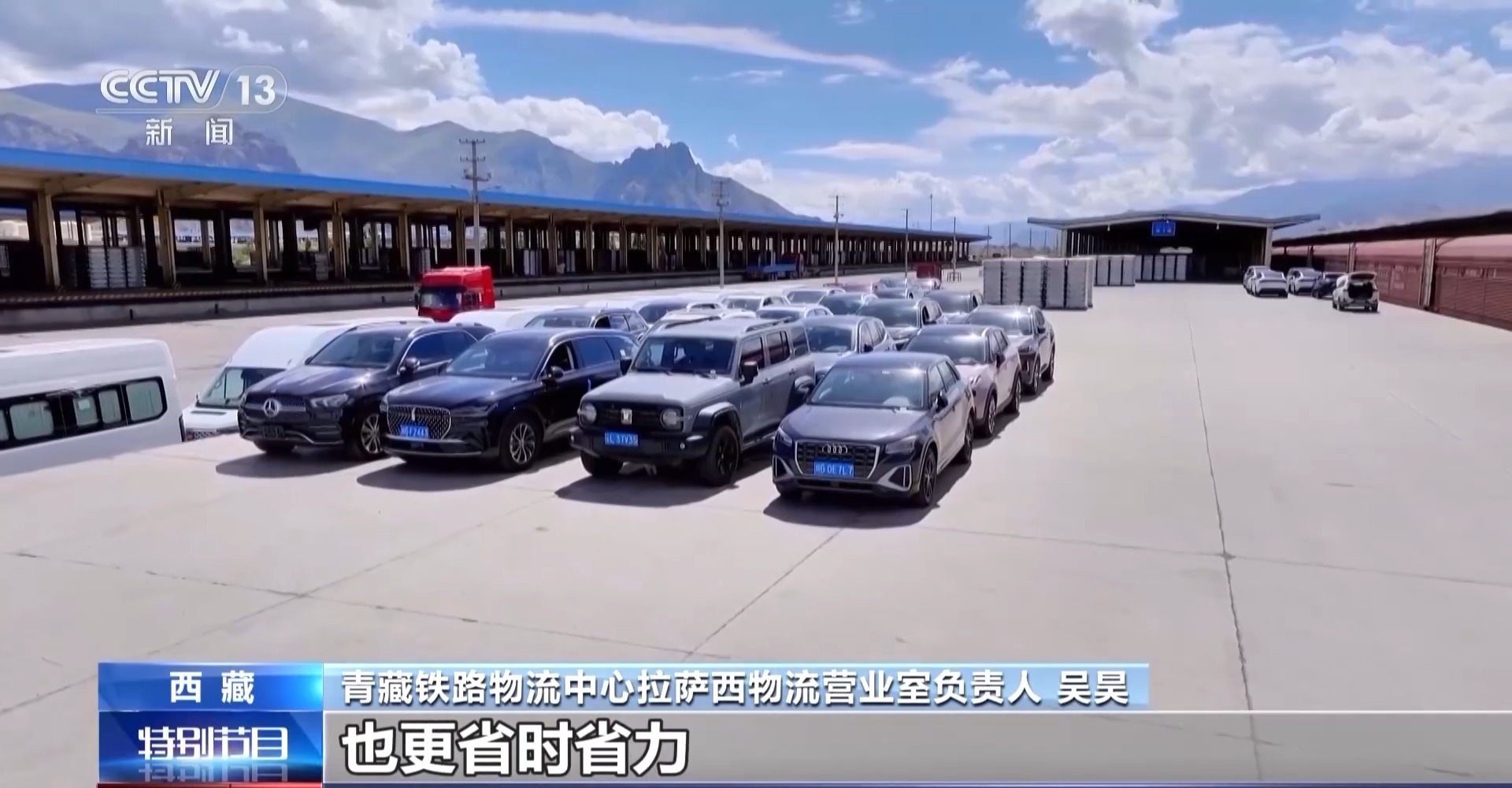 *青藏鐵路物流中心拉薩西物流營業室負責人 吳昊:*像這種車型就是我們鐵路為了小汽車運輸的專門車型,裝小汽車能達到一百三四十輛。有的朋友喜歡把車輛拖到拉薩以後,開車去周邊玩,也更省時省力。