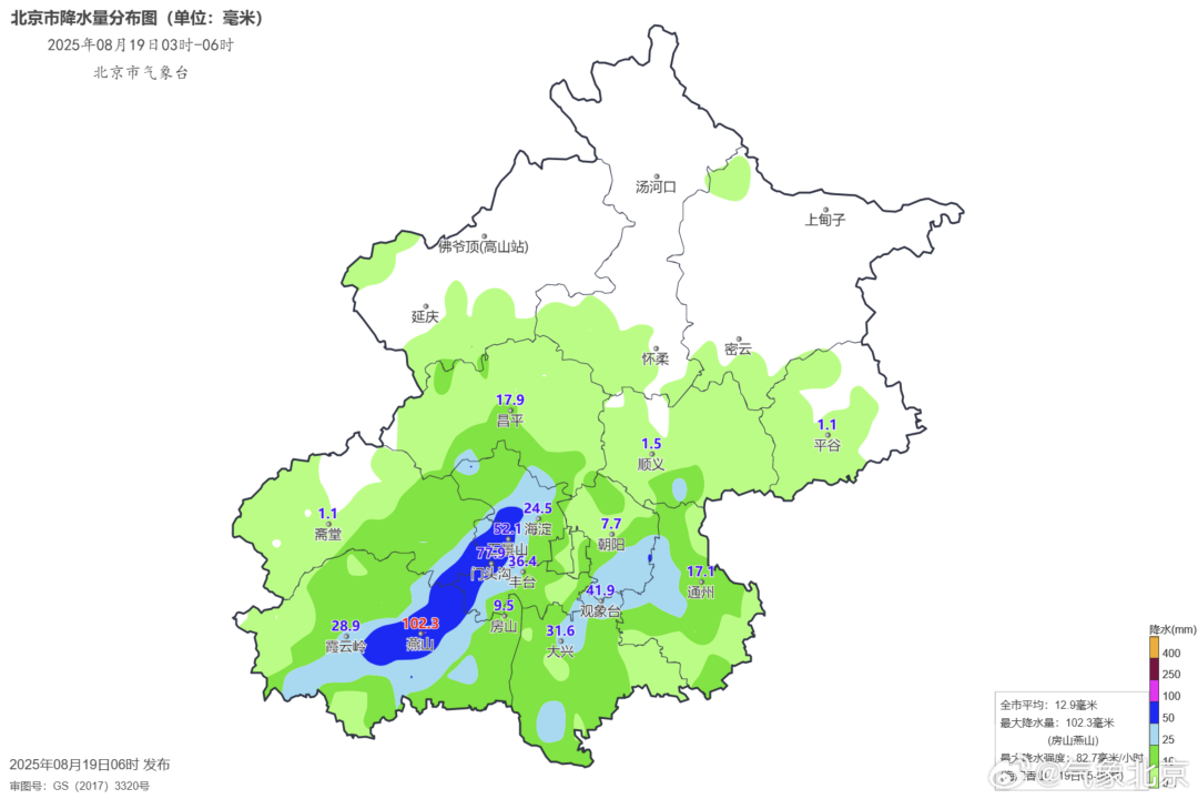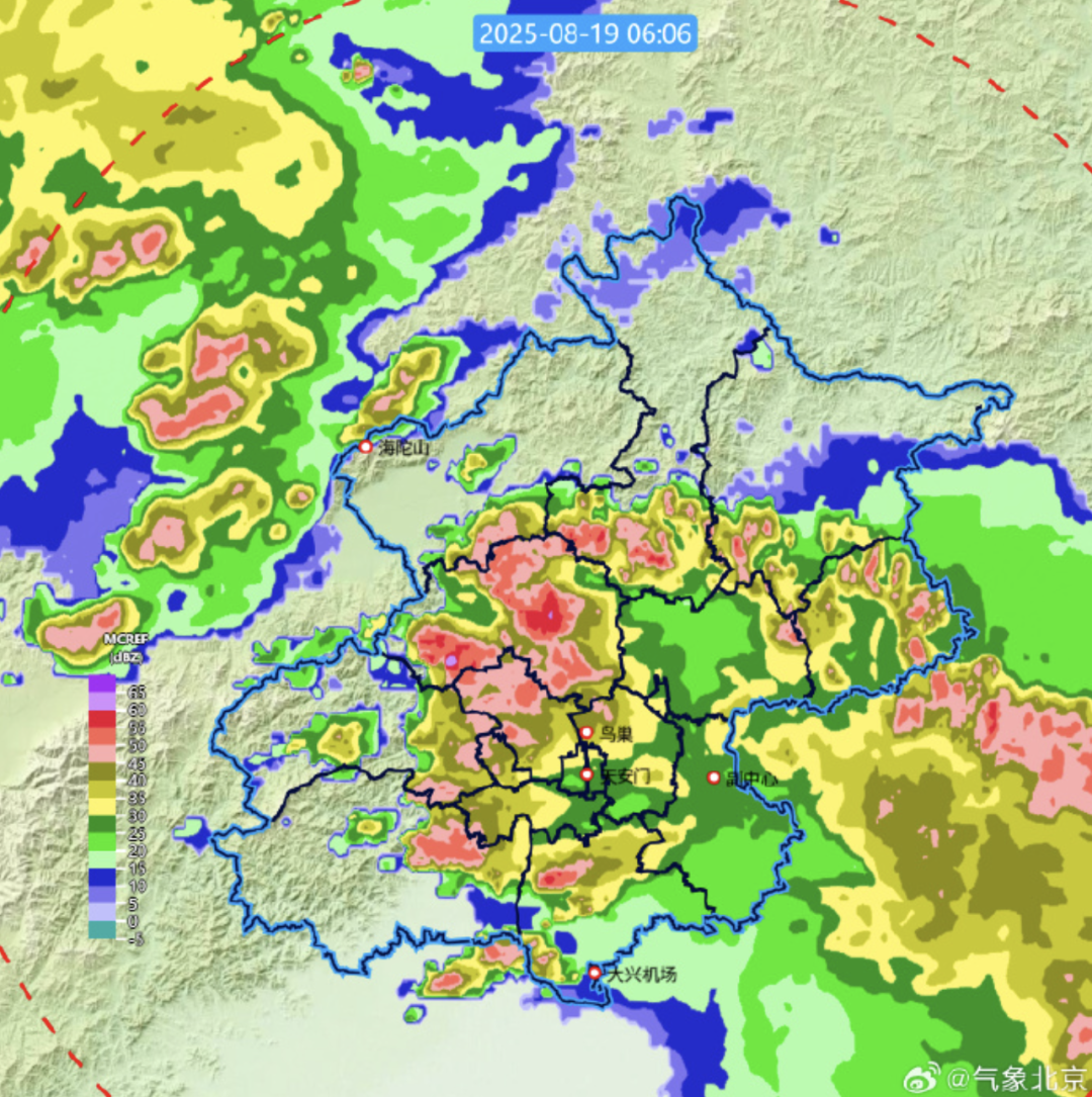 截至今晨6時,北京全市平均降水量12.9毫米,城區平均26.2毫米。最大降水量出現在房山燕山102.3毫米;最大降水強度出現在海淀香山,19日05時-06時降水82.7毫米。目前北京暴雨黃色、雷電黃色和大風藍色預警中。密雲、懷柔暴雨紅色預警、海淀、石景山暴雨橙色預警中。