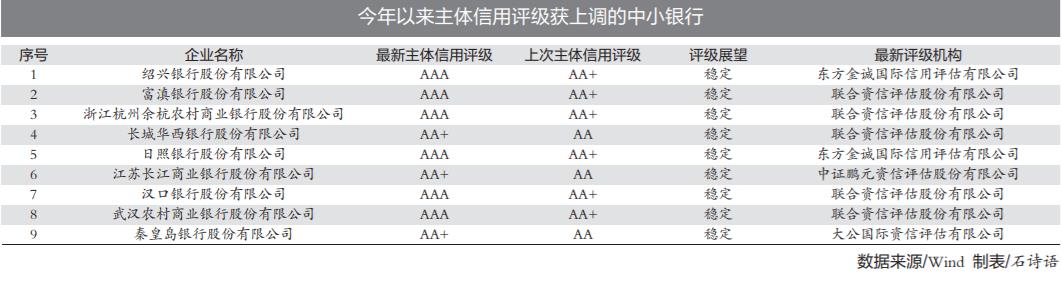 據統計,今年以來已有9家銀行獲評級機構上調主體信用評級。具體來看,聯合資信對富滇銀行、浙江杭州餘杭農商行、漢口銀行、武漢農商行的主體信用評級從AA+調高至AAA,對長城華西銀行的主體信用評級由AA上調至AA+;東方金誠對紹興銀行、日照銀行的主體信用評級從AA+調高至AAA;中證鵬元資信對江蘇長江商業銀行的主體信用評級、大公國際資信對秦皇島銀行的主體信用評級分別由AA上調至AA+。