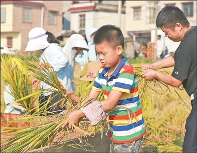 廣西壯族自治區賀州市富川瑤族自治縣富陽鎮竹梢村,小朋友在體驗打稻穀。