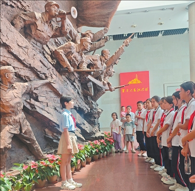 位於山西省陽泉市的百團大戰紀念館,一名“紅領巾講解員”在為“石榴籽一家親”2025年晉疆青少年融情夏令營的學生進行講解。暑假期間,共青團陽泉市委、陽泉市少工委組織開展了“紅領巾講解員”志願服務活動,幫助來參觀的學生更好地瞭解紅色歷史和文化。